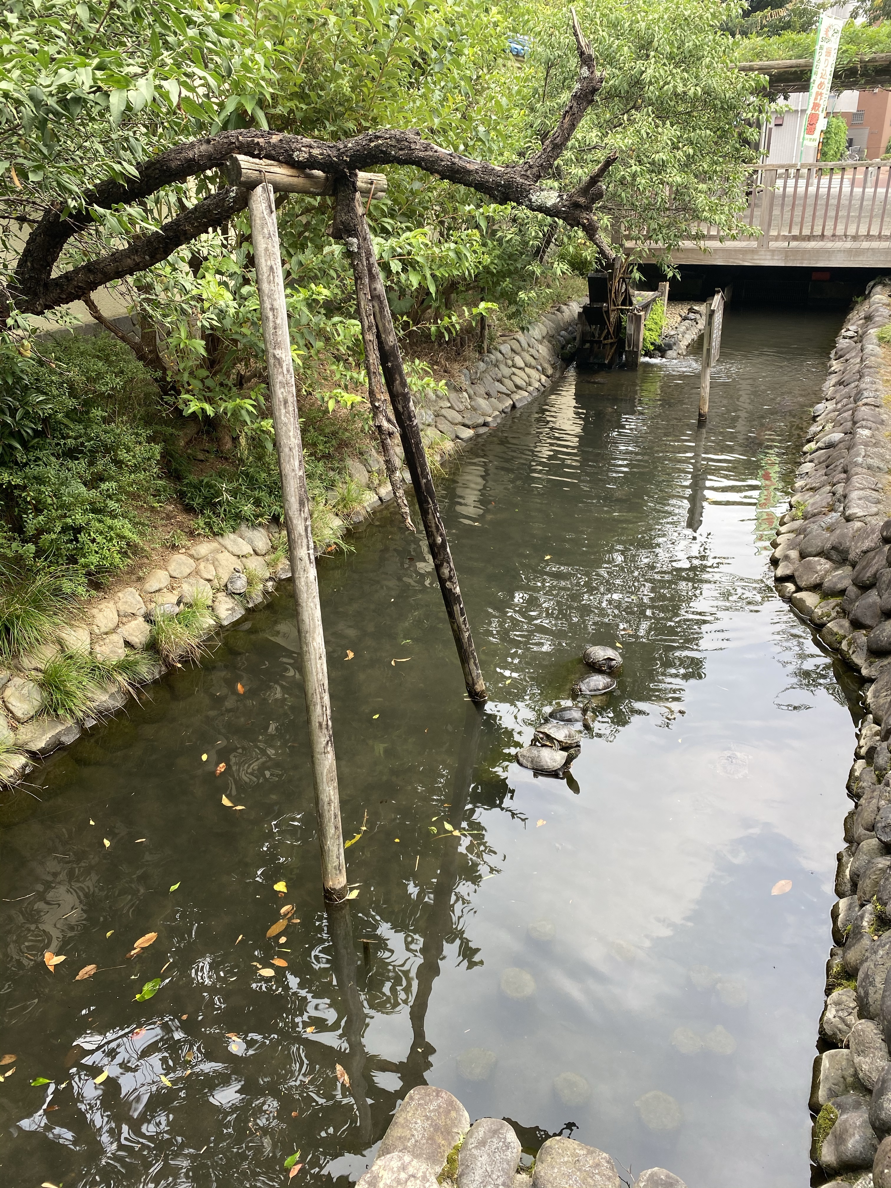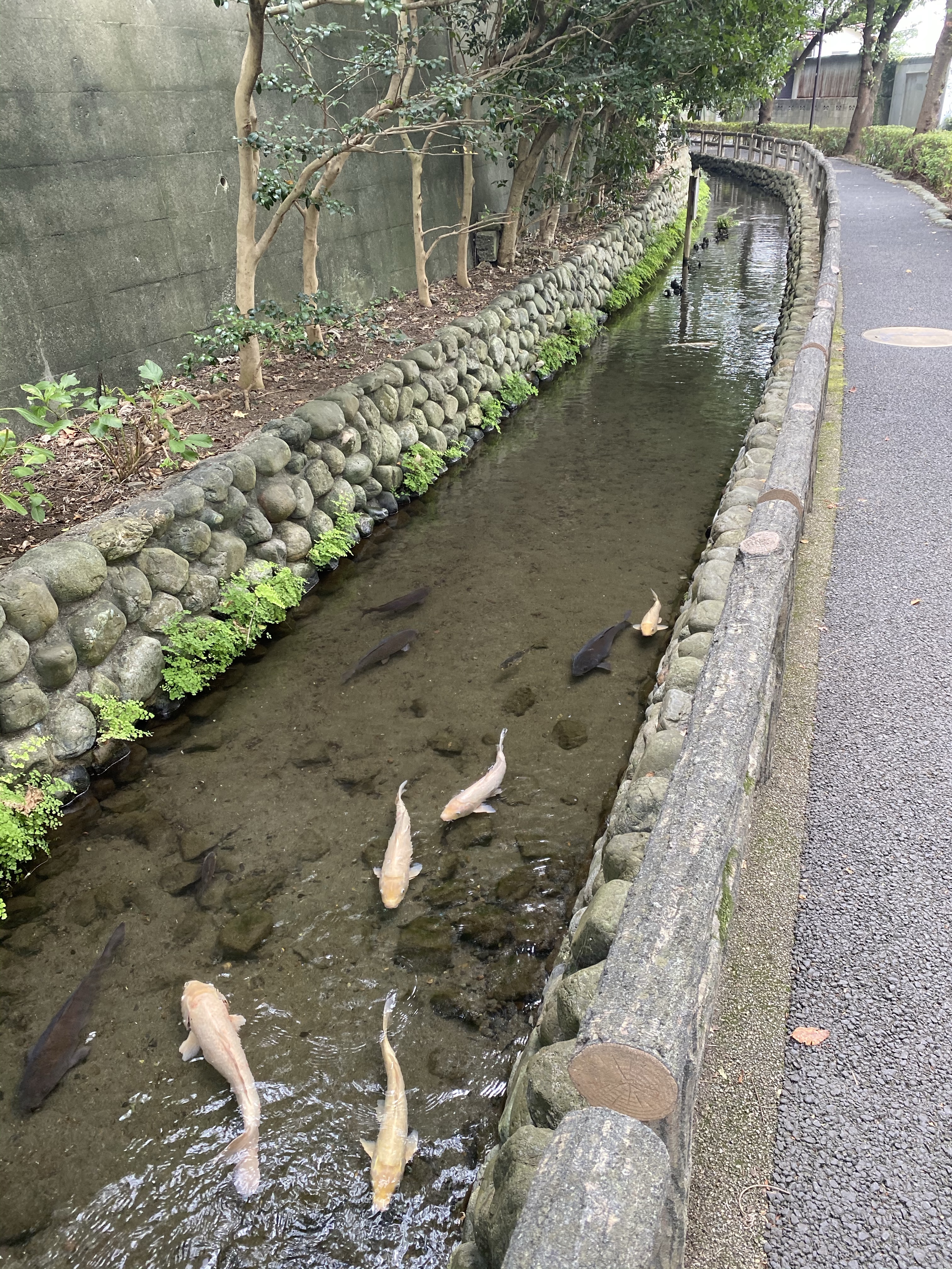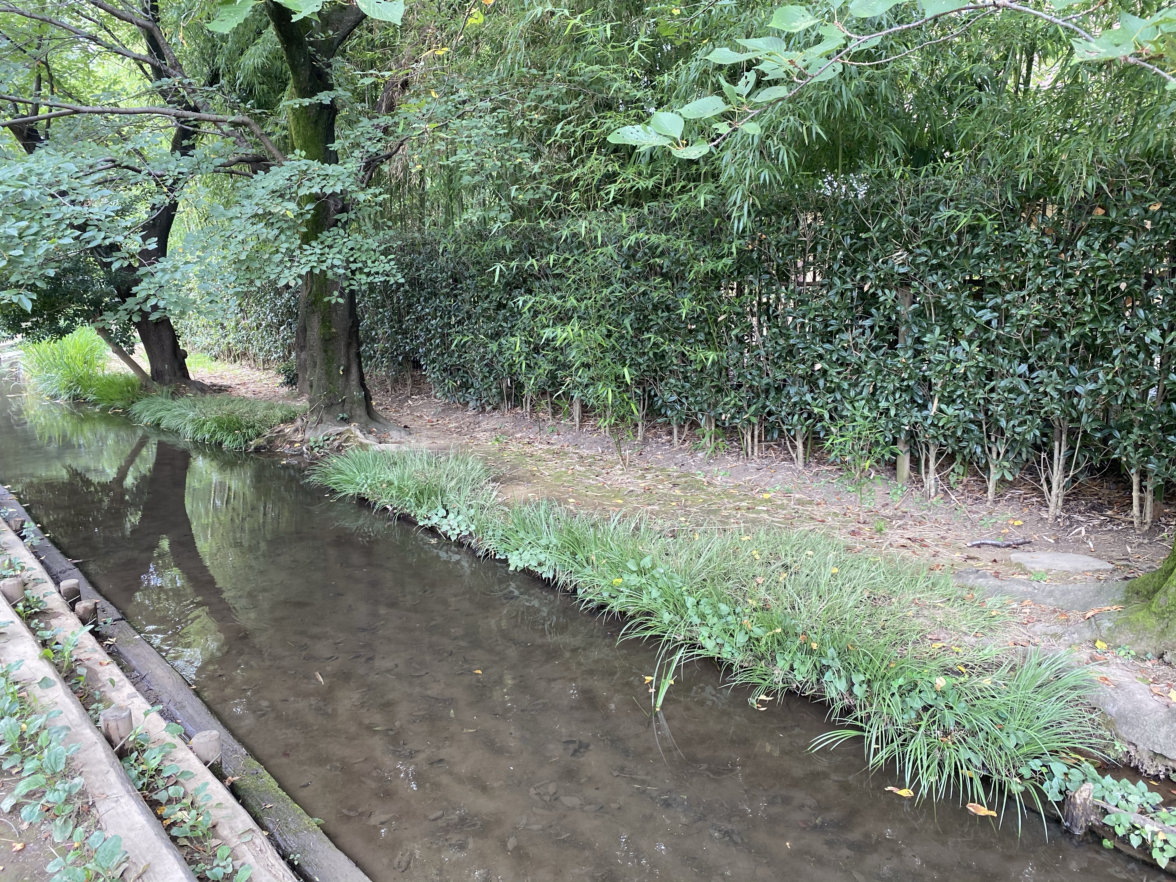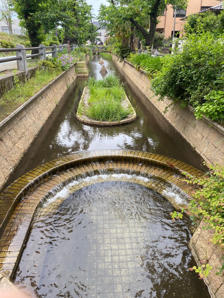 用水路には、水車があり昔の農業用水であった姿を偲ぶことができます。多摩川駅から水車までは、少し水深があるので、鯉が泳いでおり、用水路の歩道側ではない方には、植林がなされているので、暑さを避けることもできます。